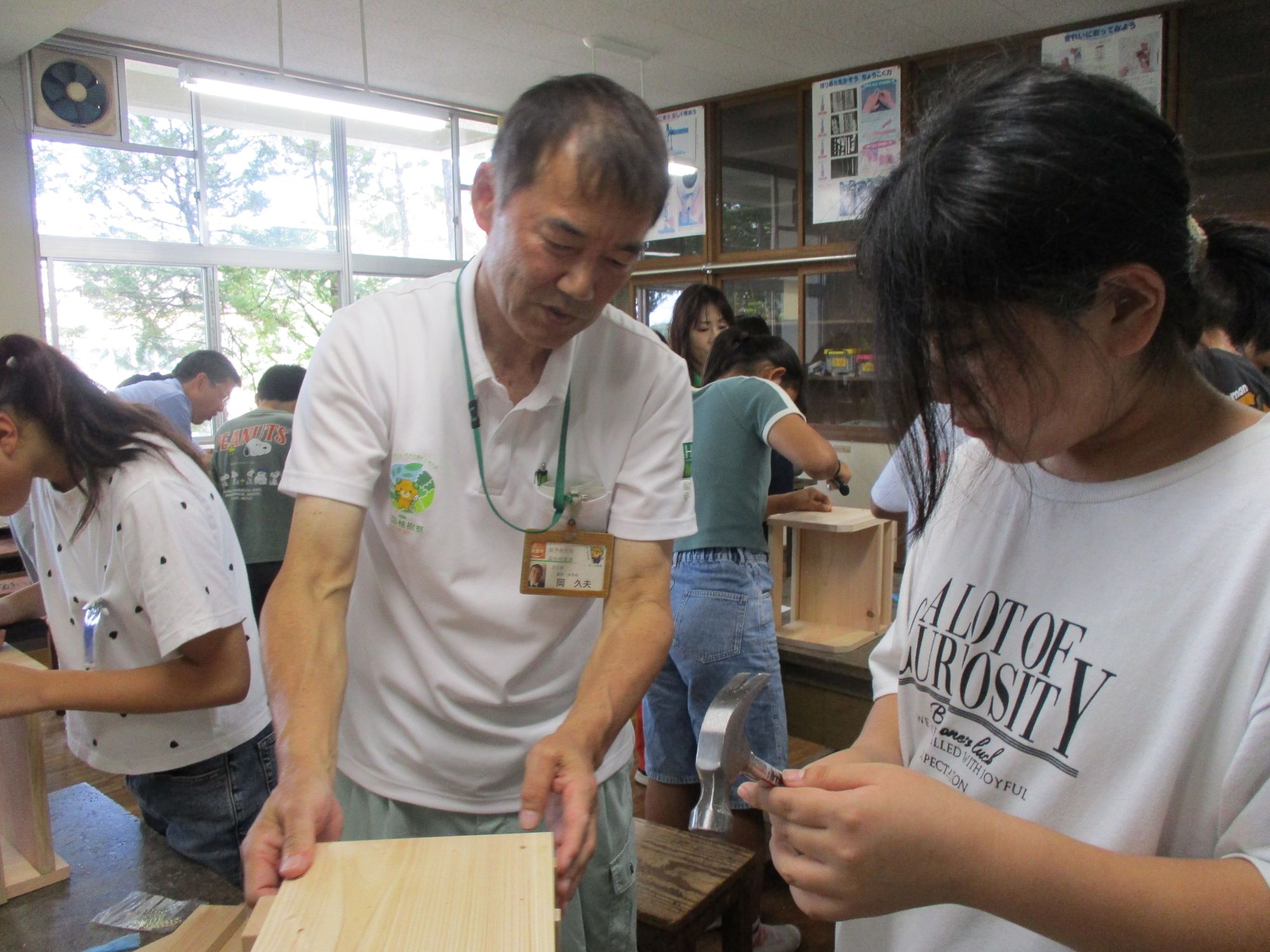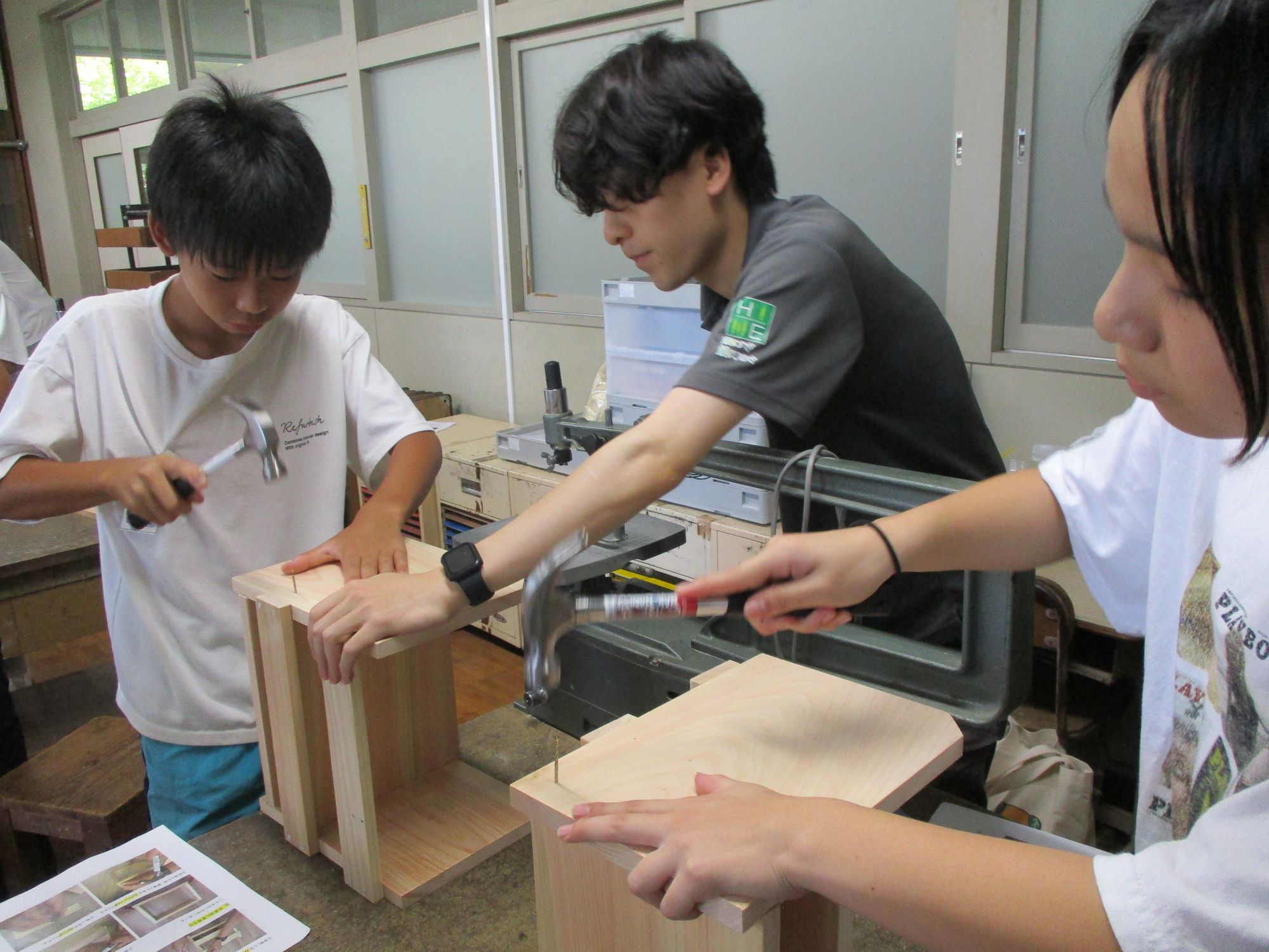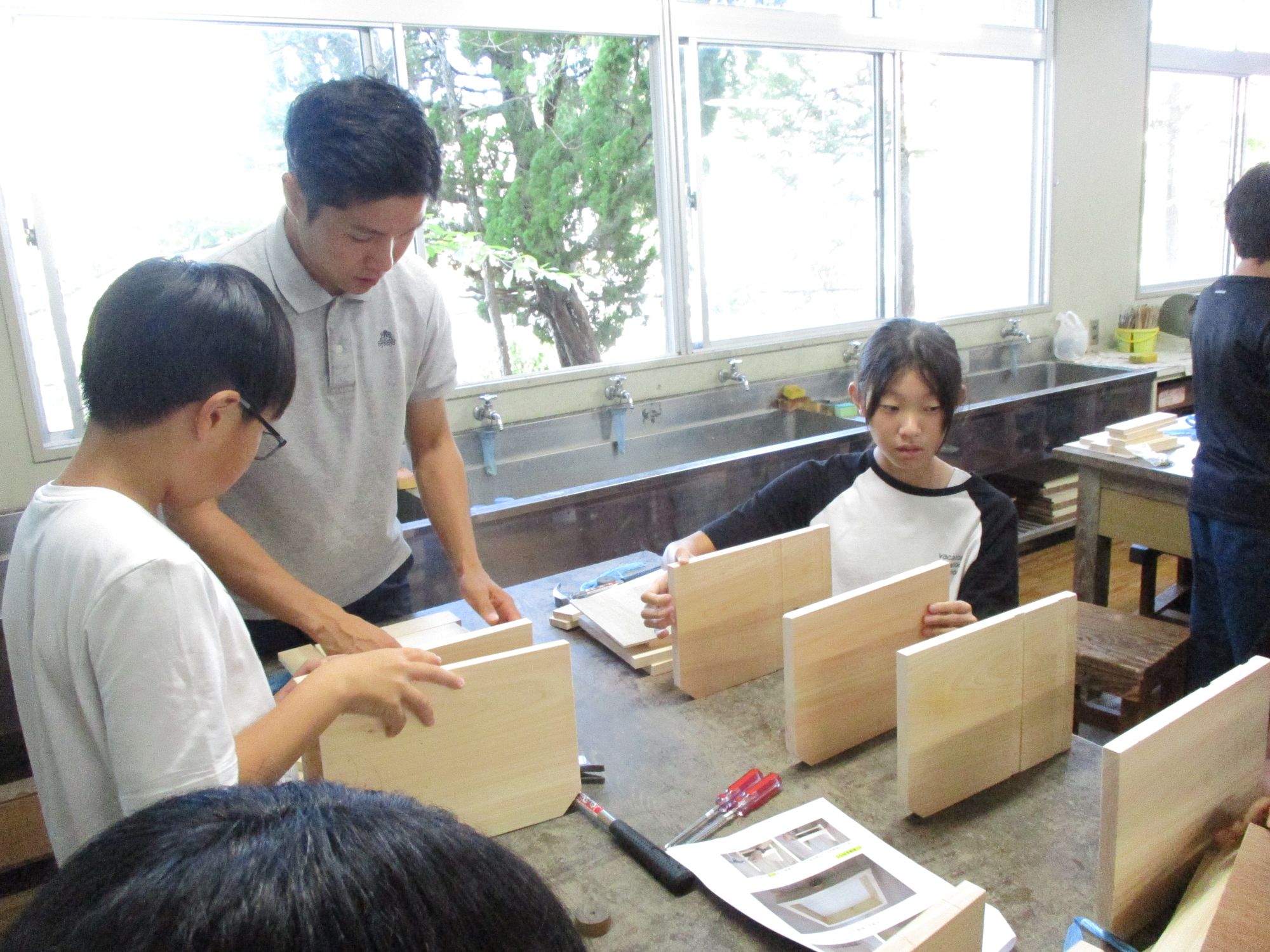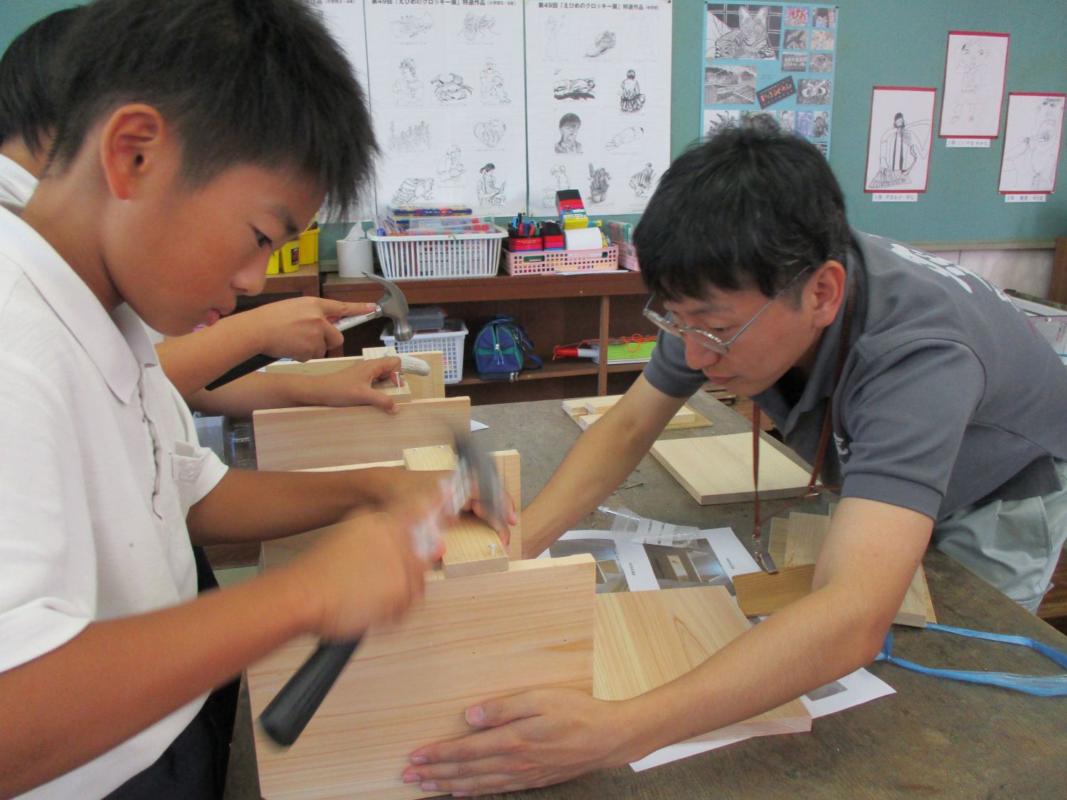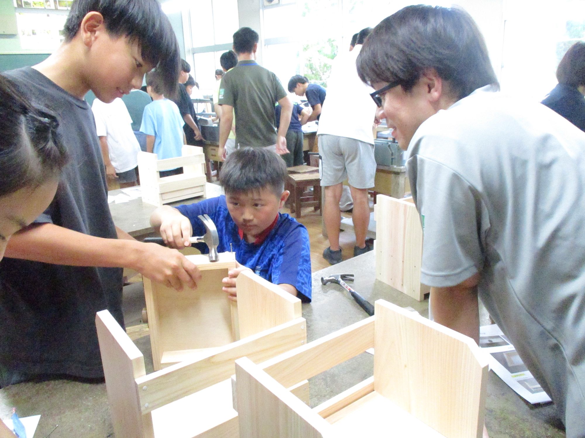 教室中釘を打つ音で満たされました。みんな硬い材に苦戦しながらも、1時間程度で何とか完成。