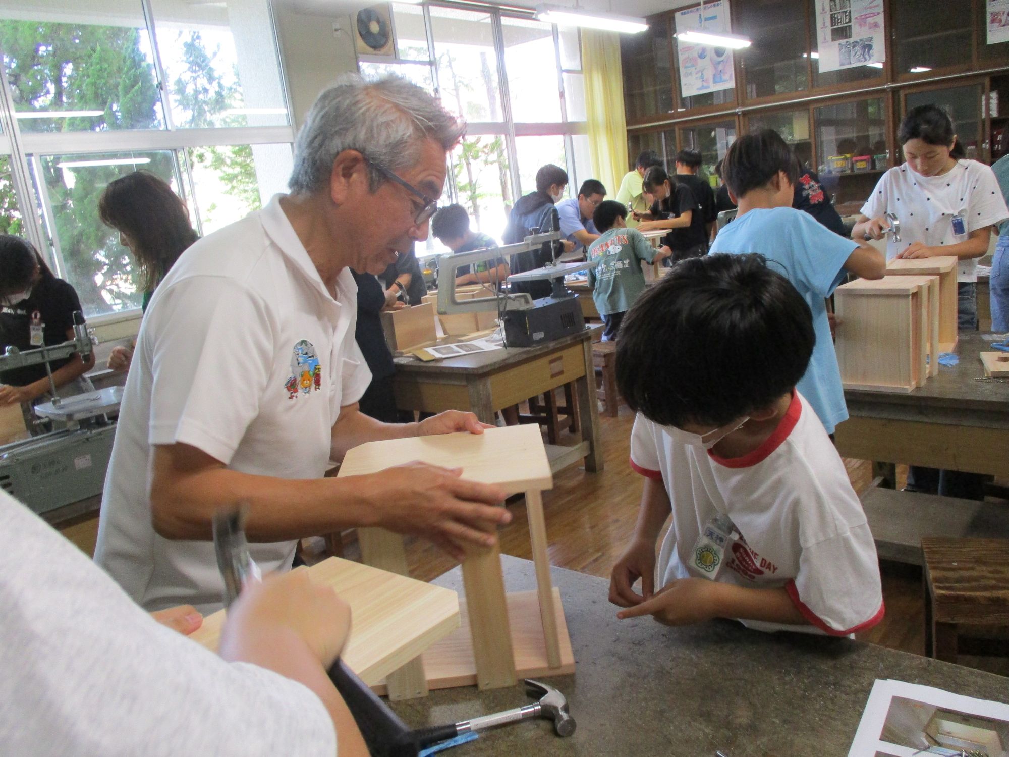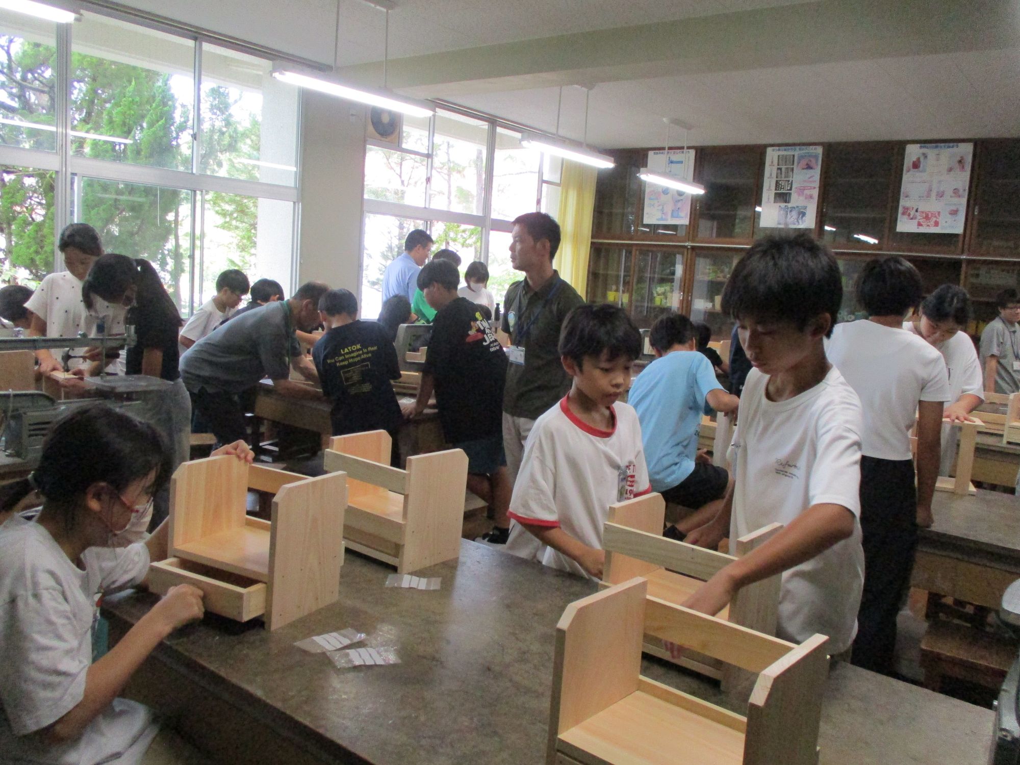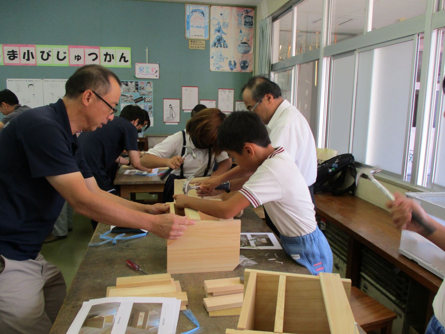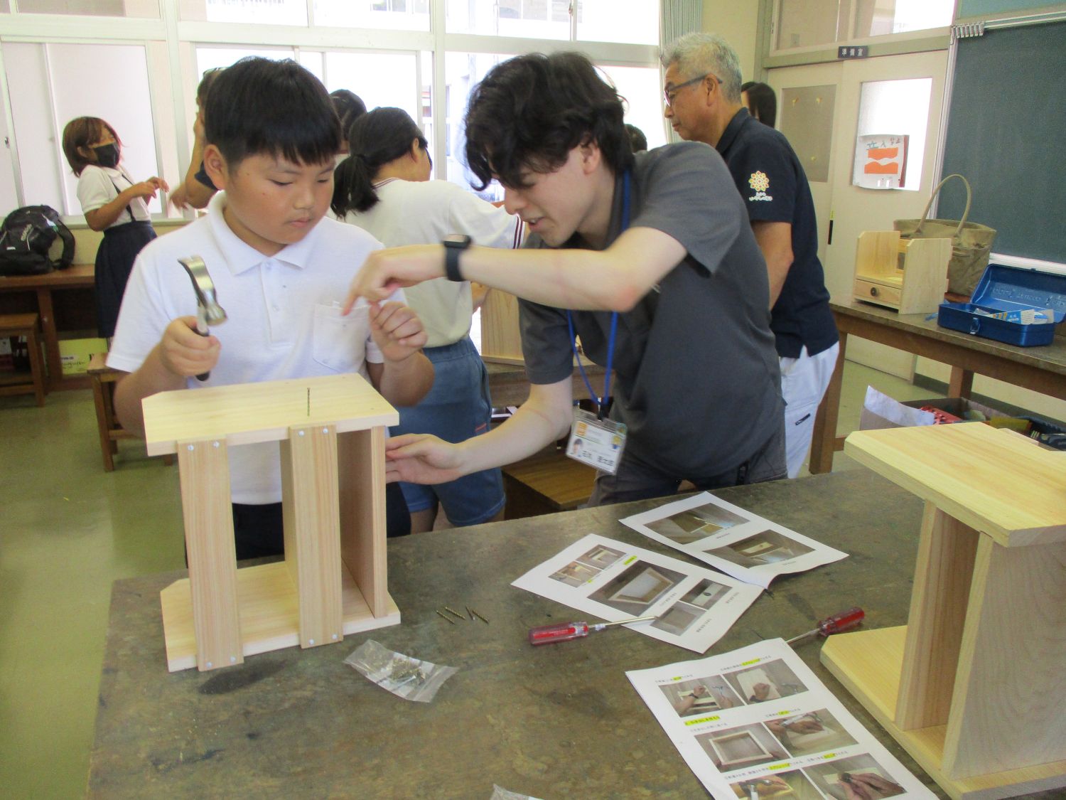 その後、引き出し付き本立て作りに挑戦。手こずりながらもみんななんとか完成!教室内は愛媛県産ヒノキの香りとともに、児童たちの喜びの笑顔がいっぱいになりました。