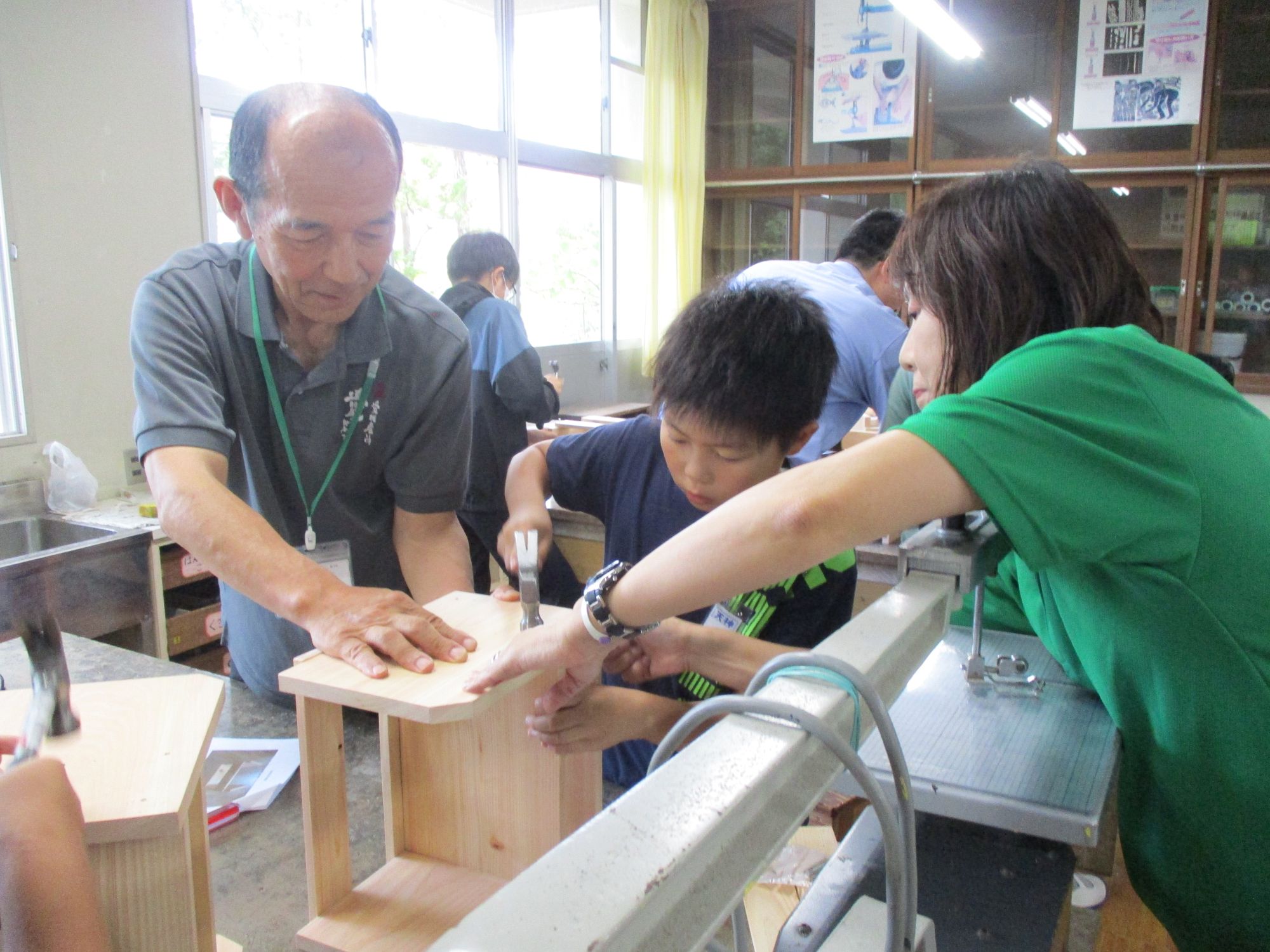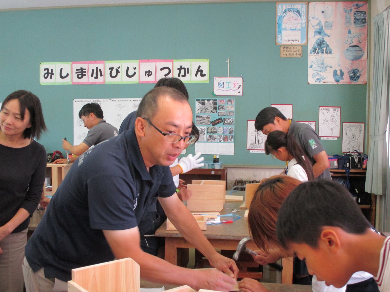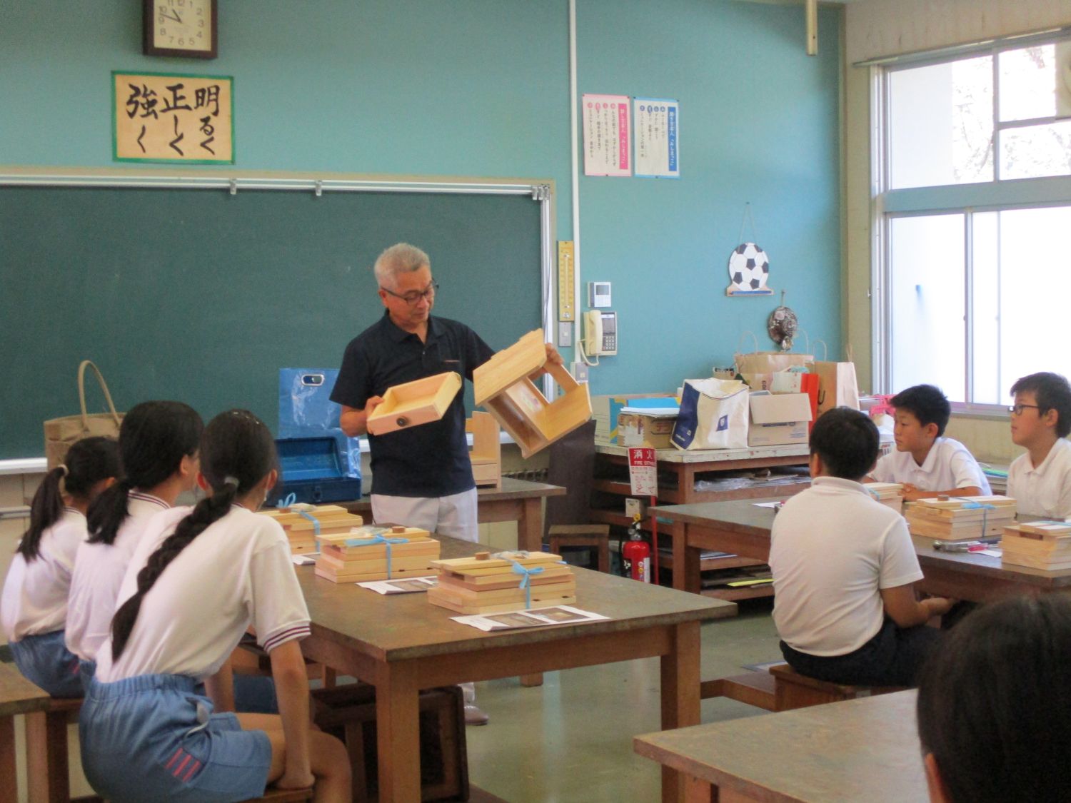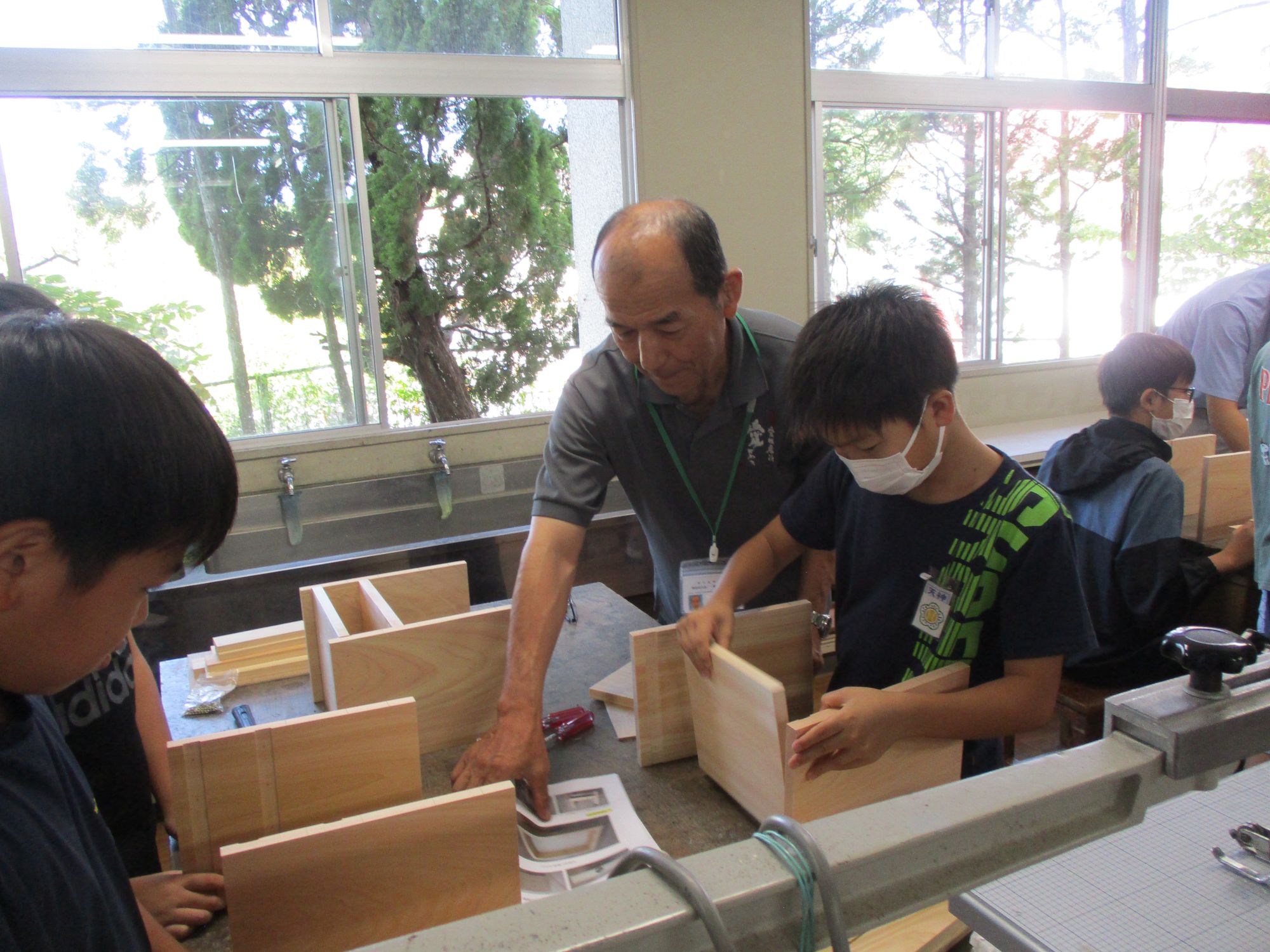 その後、引き出し付き本立て作りに挑戦。手こずりながらもみんななんとか完成!教室内は愛媛県産ヒノキの香りとともに、児童たちの喜びの笑顔がいっぱいになりました。