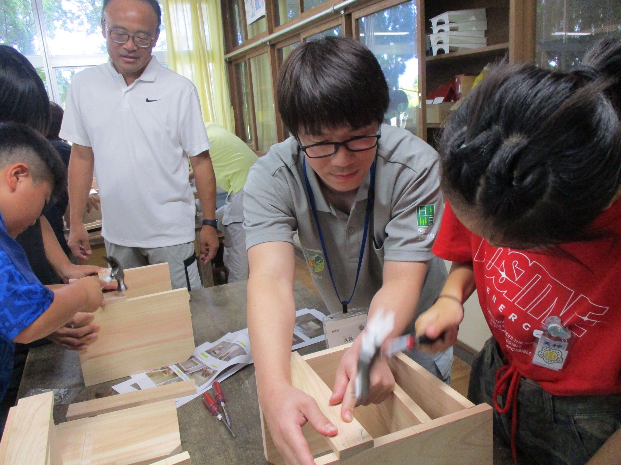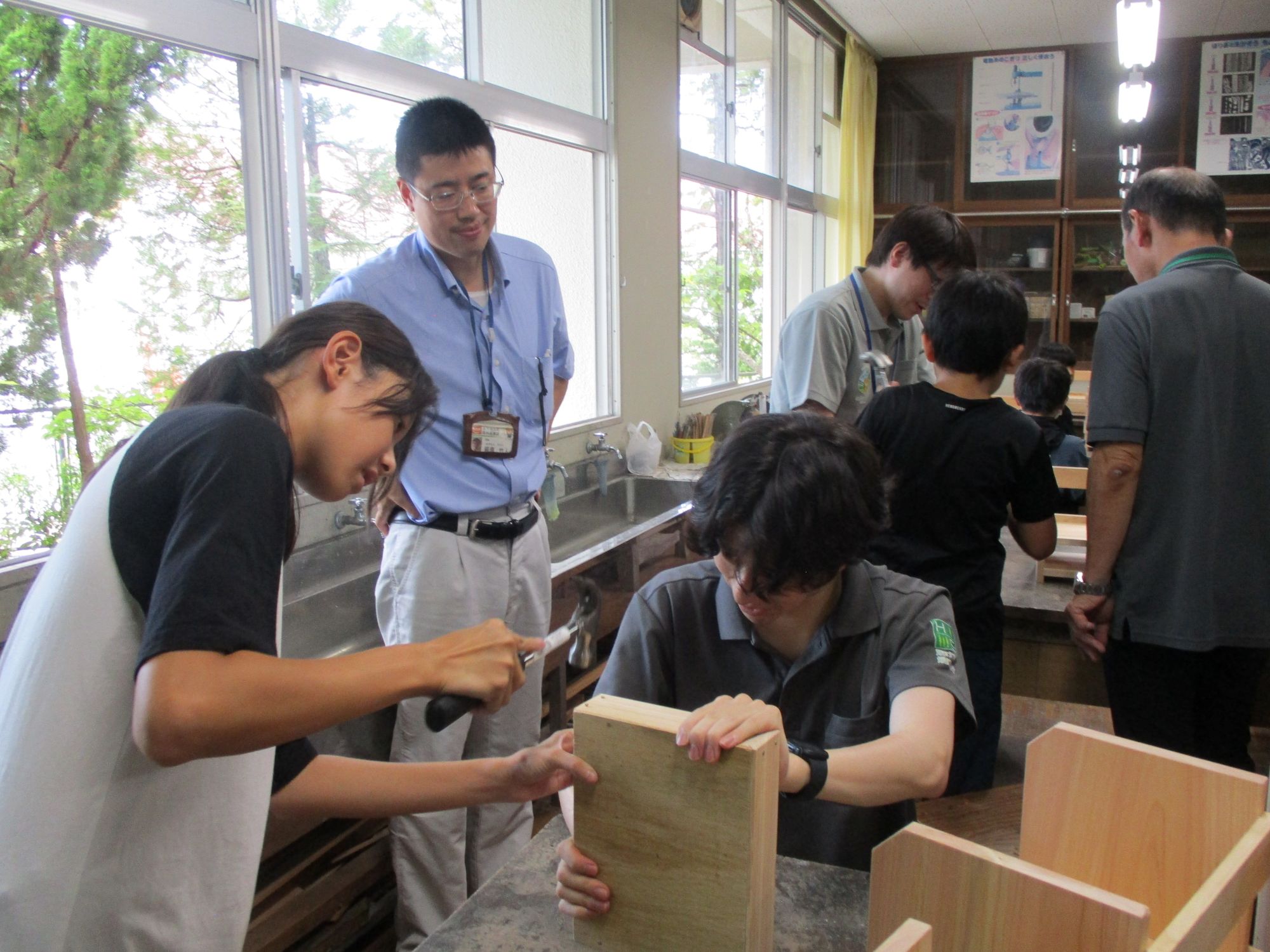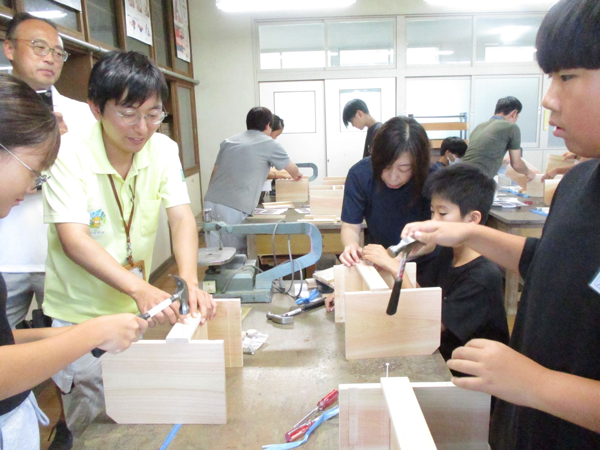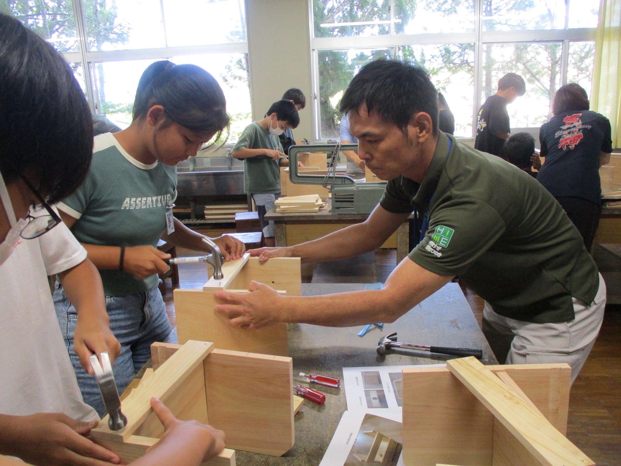 講義の後の木工教室では、愛媛県産ヒノキを使った引き出し付き本立て作りに挑戦!!