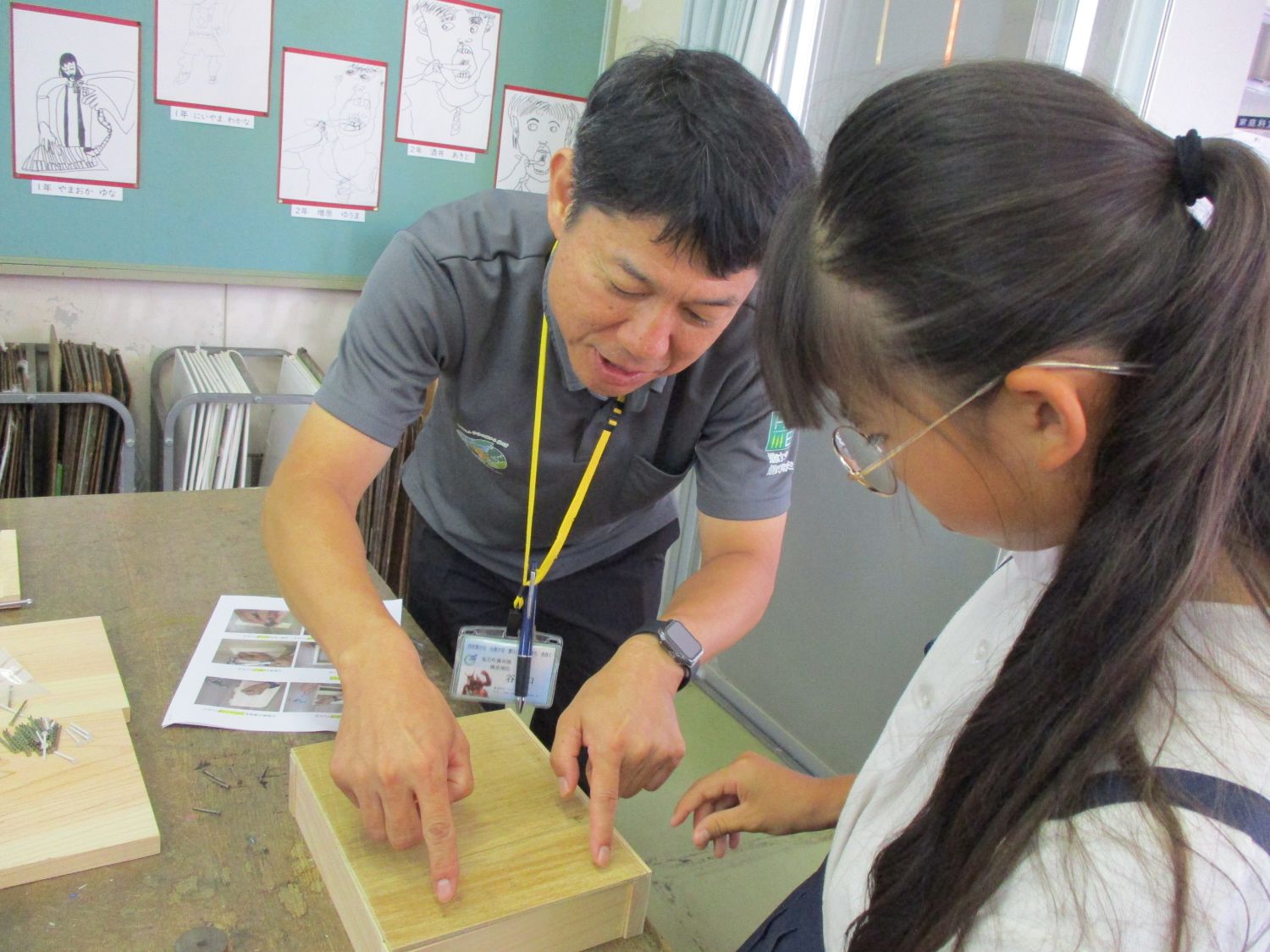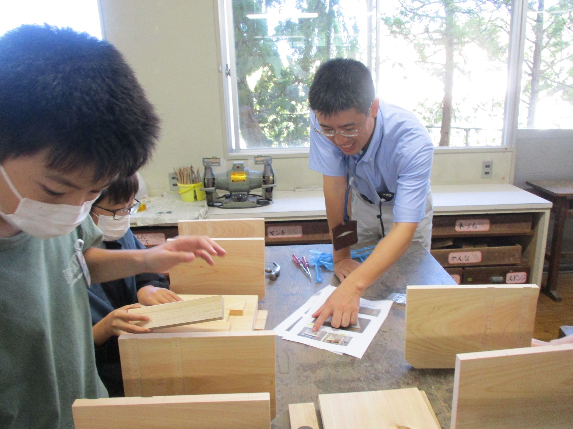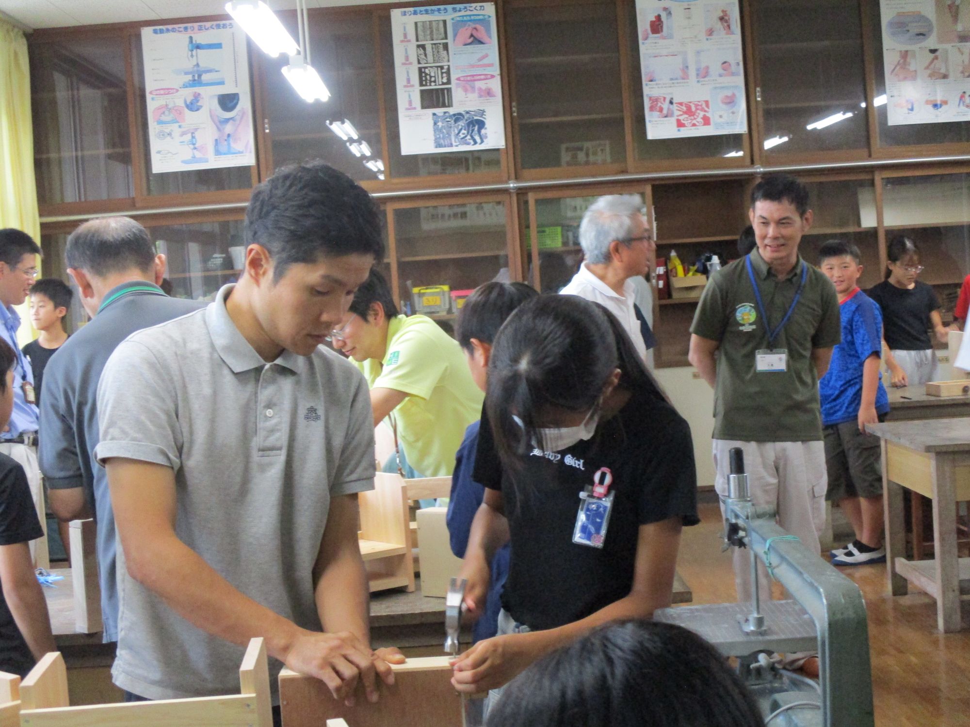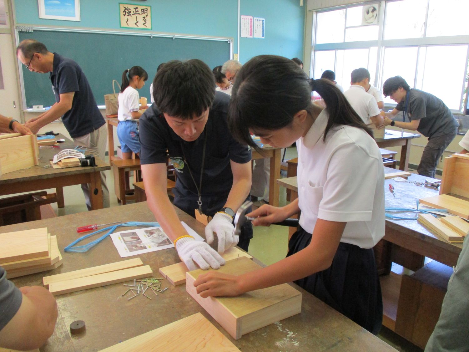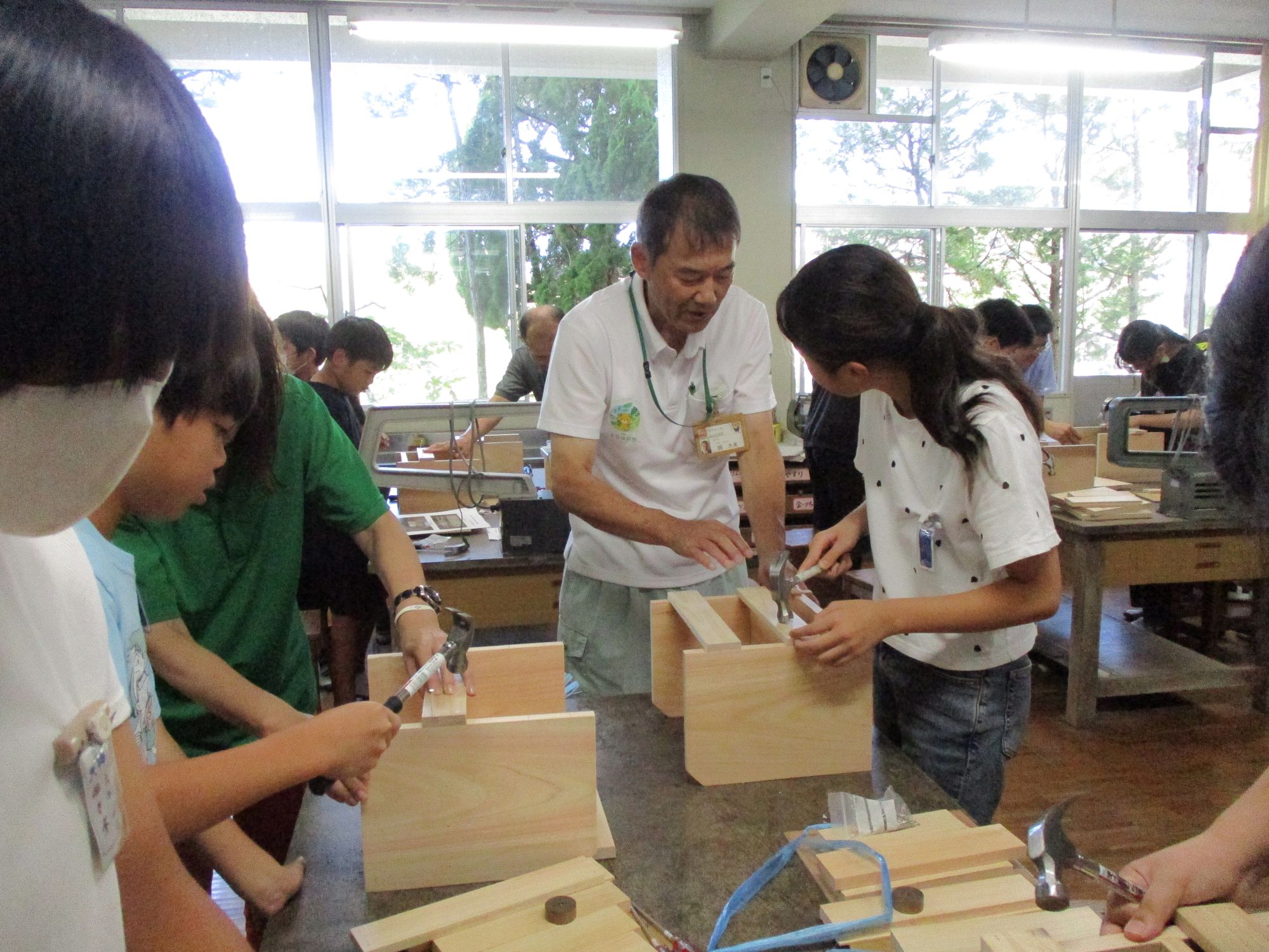 講義の後の木工教室では、愛媛県産ヒノキを使った引き出し付き本立て作りに挑戦!!