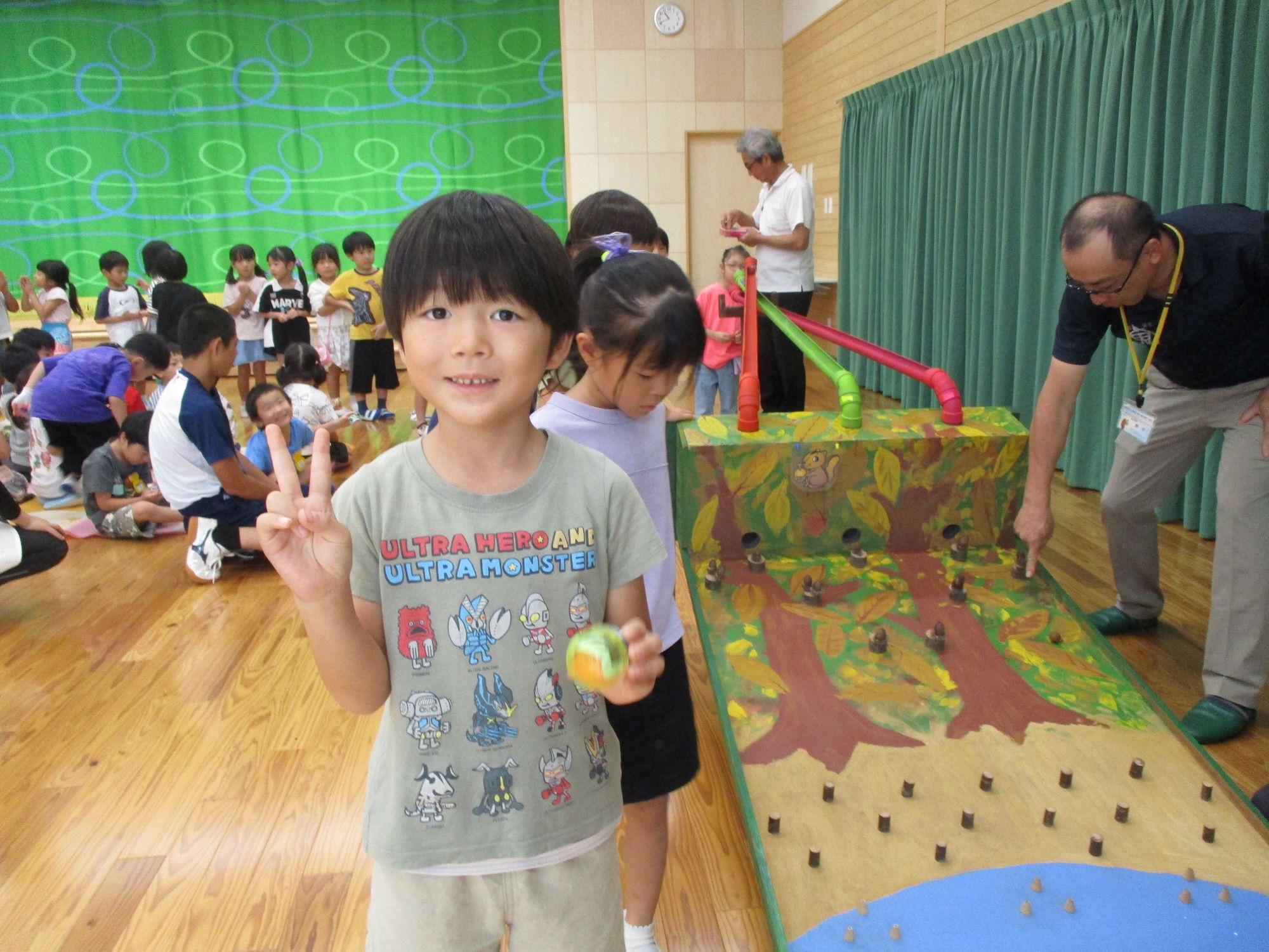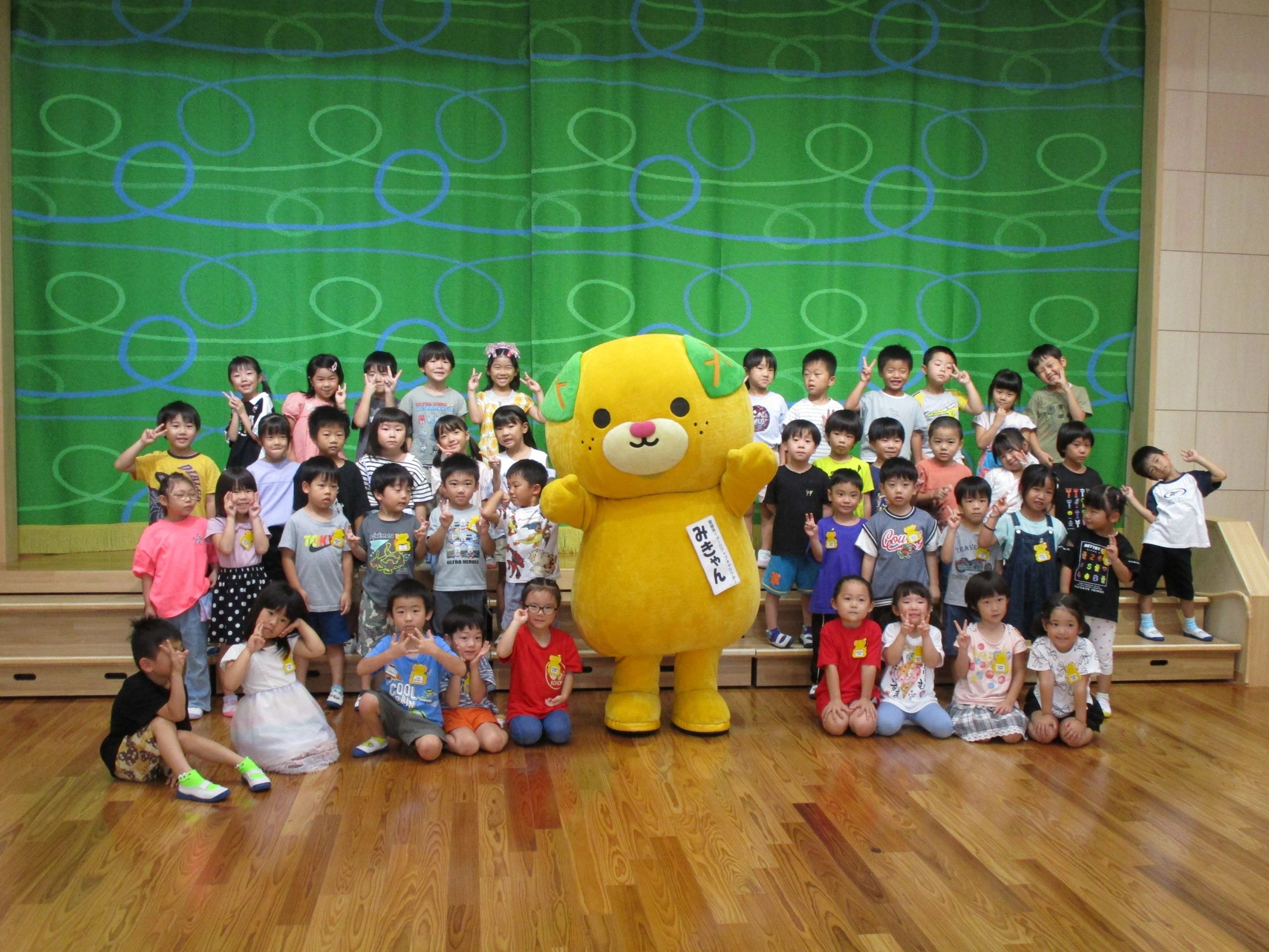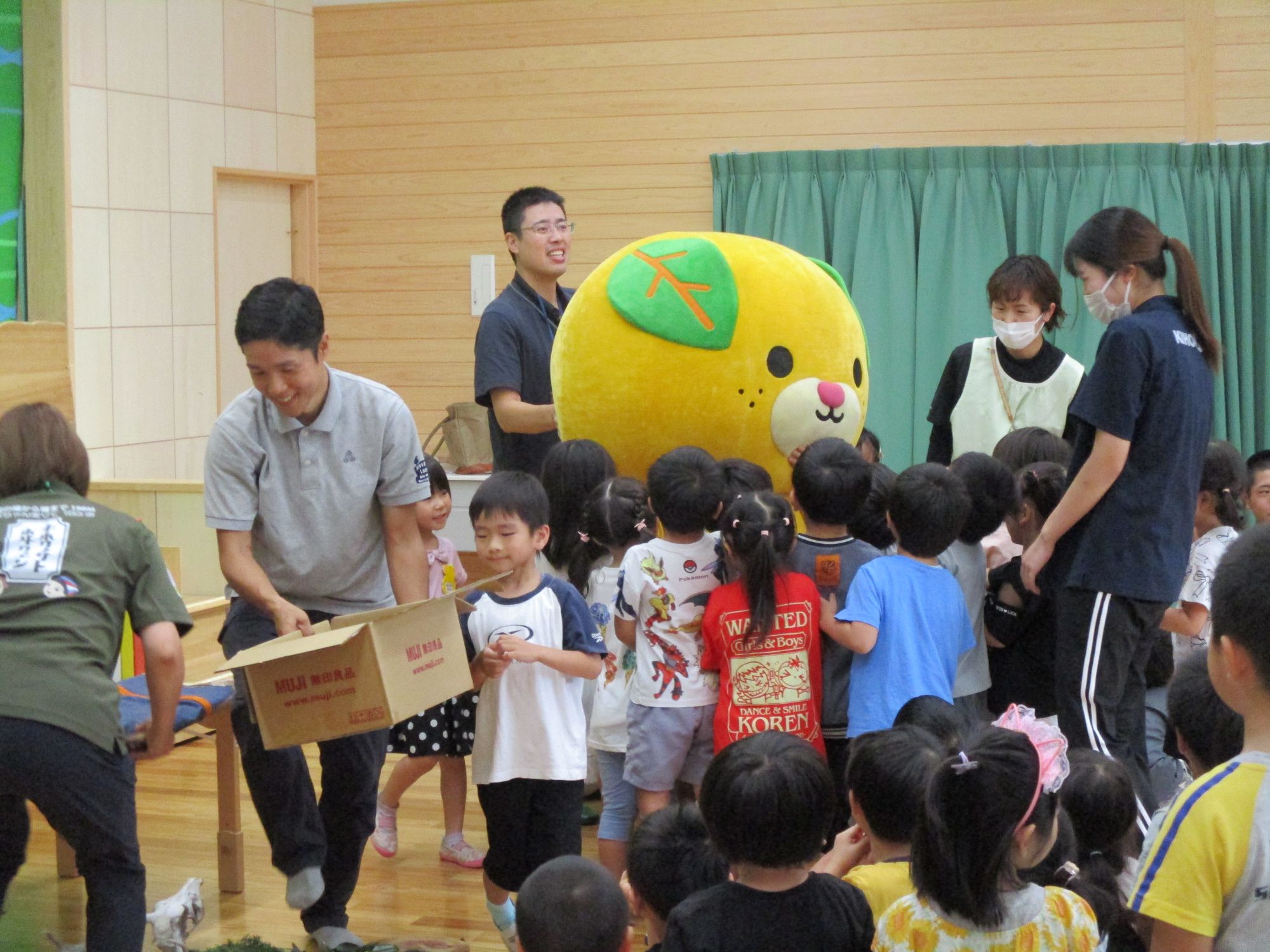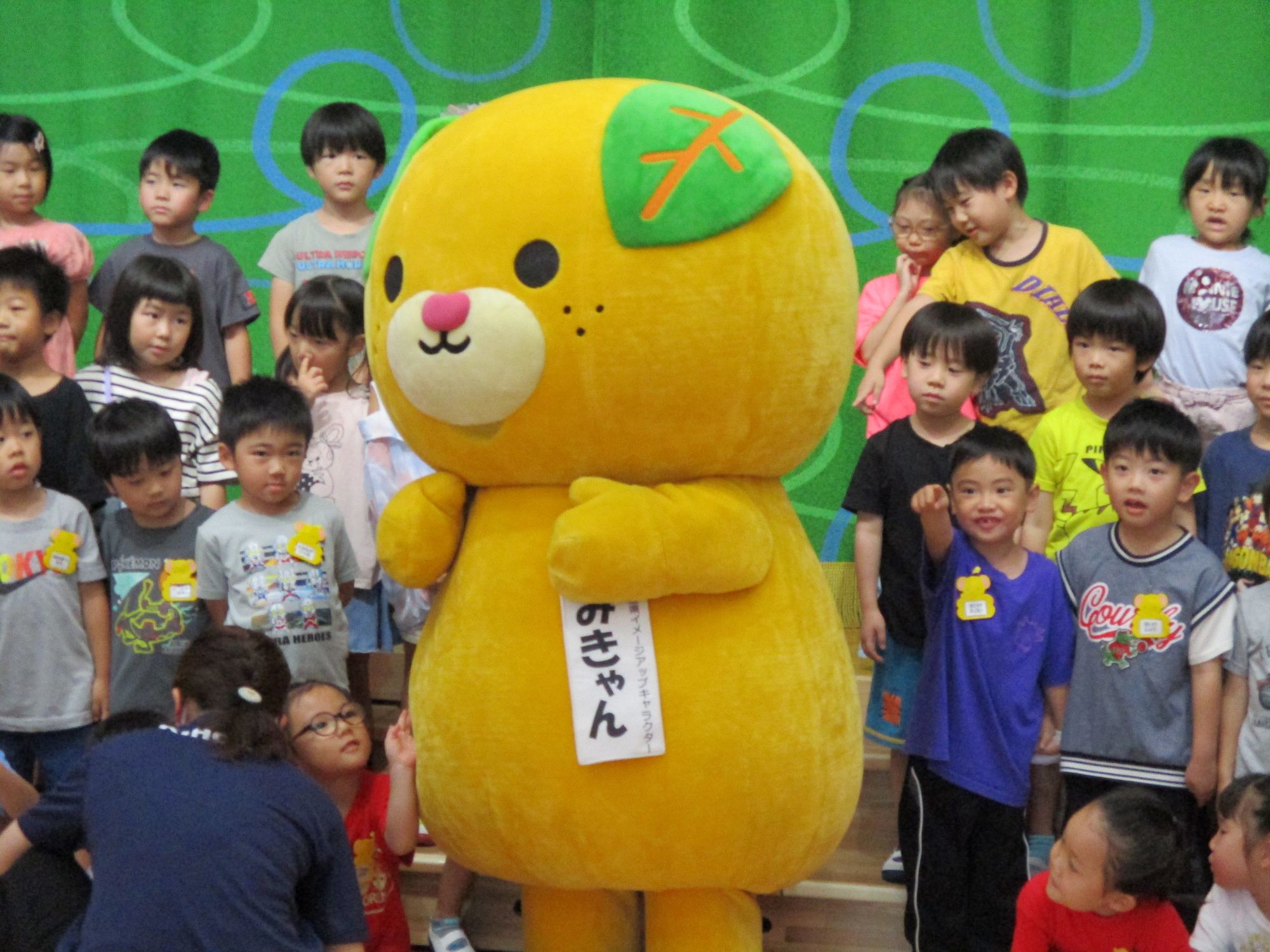 9月24日、鬼北町きほくの里保育園を訪れ、森の教室を開催しました。子供たちは、木の紙芝居を見たり、実際に葉っぱを触ったりしながら森について勉強しました。突然教室に現れたみきゃん!もちろん大歓声!最後にドングリを転がして遊ぶゲームも楽しみました。