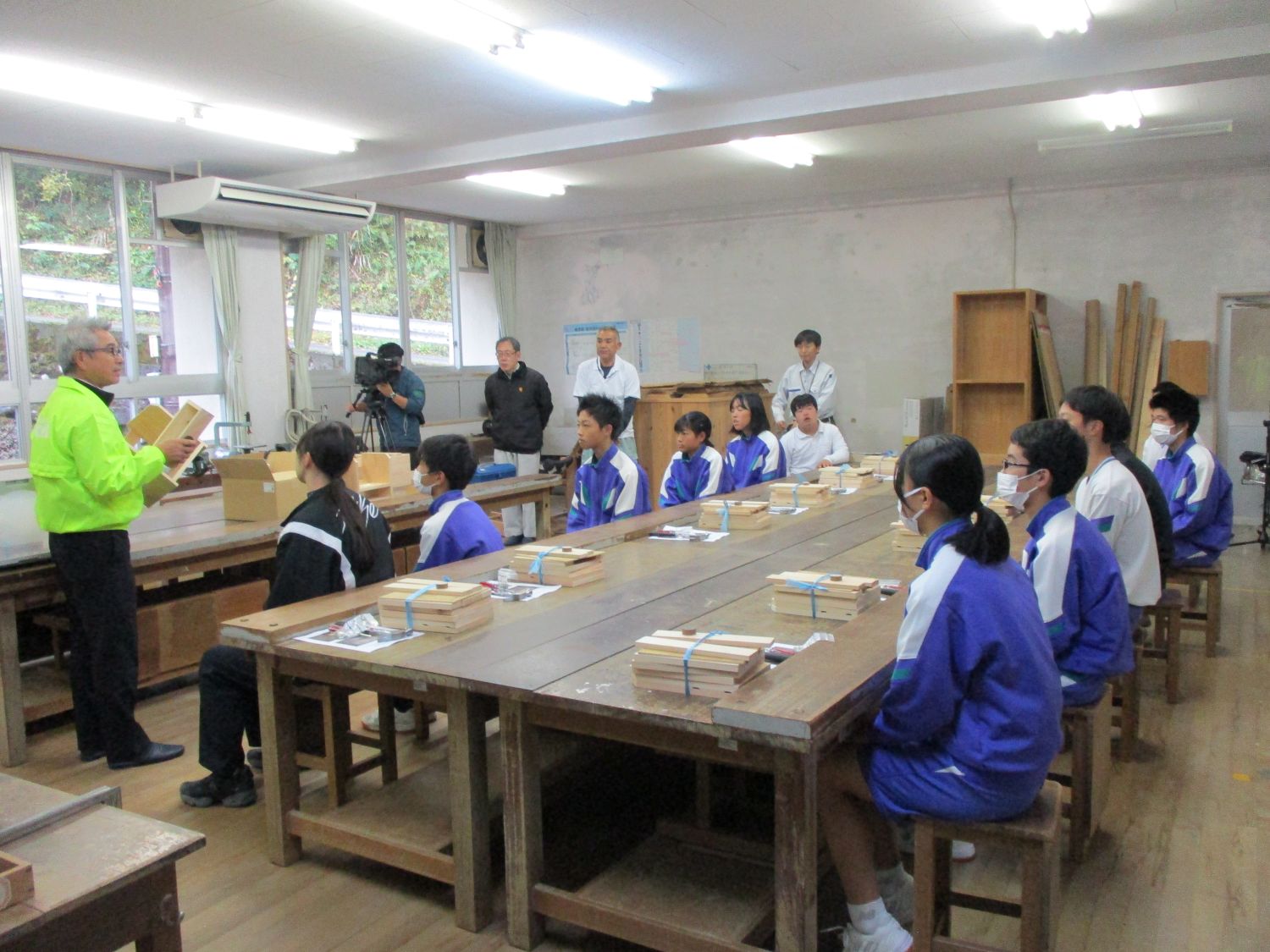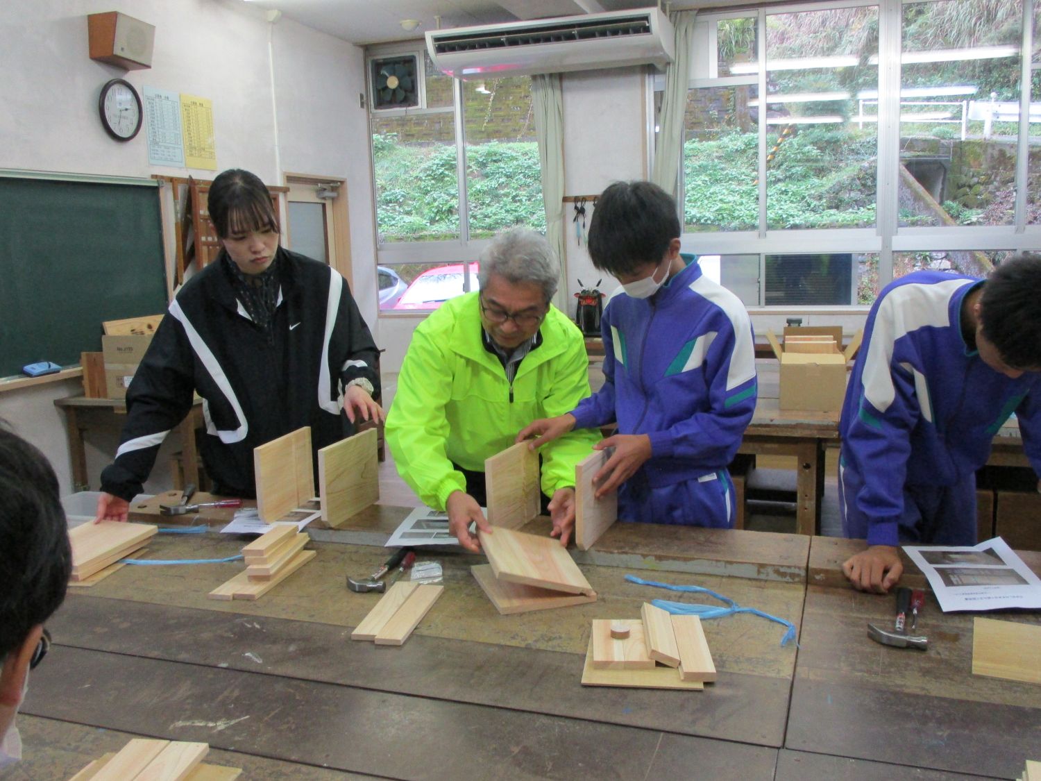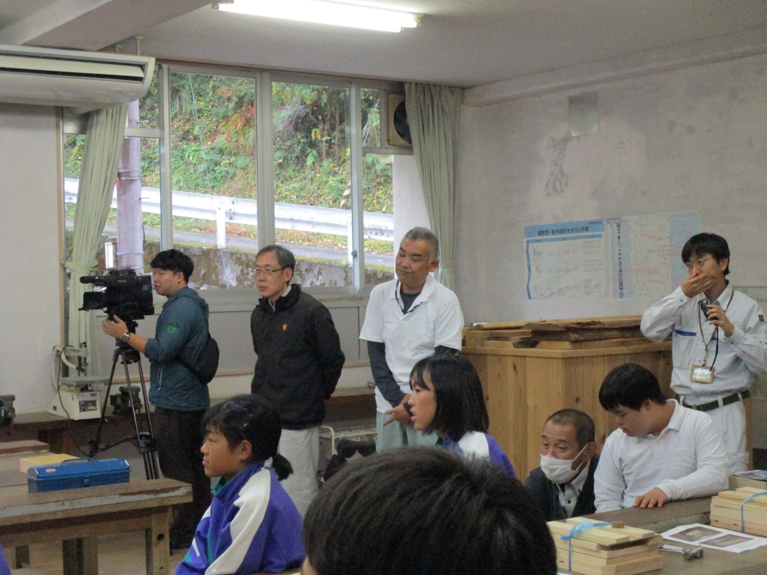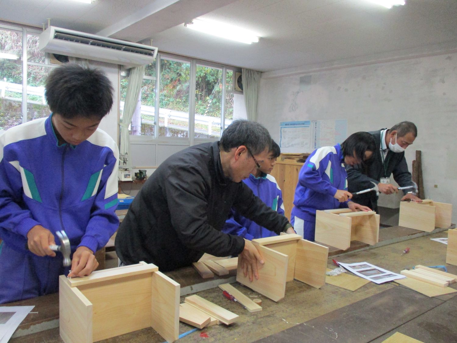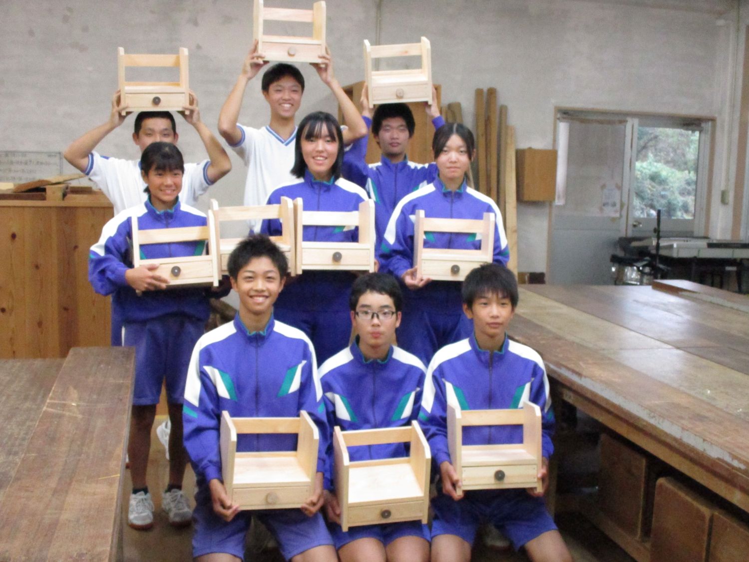 生徒の皆さん、お手伝いしていただいた学校関係者の皆様、木工材料を加工・提供していただいた鬼北町下鍵山の宮本建築様、船越友記郎講師、鬼北町農林課及び愛媛県南予地方局森林林業課の職員の皆様、大変お疲れ様でした。そして、どうもありがとうございました。<(_ _)>