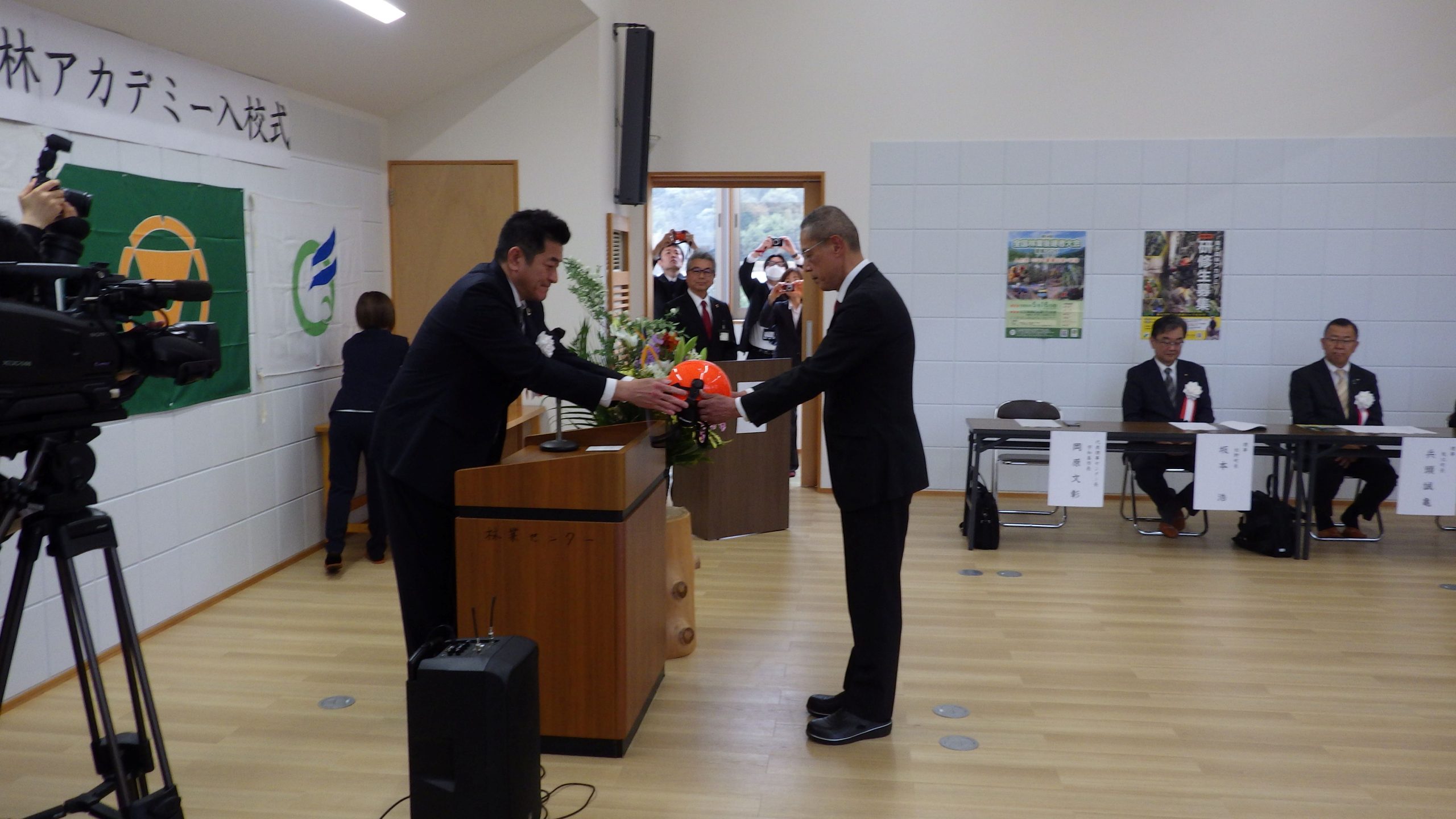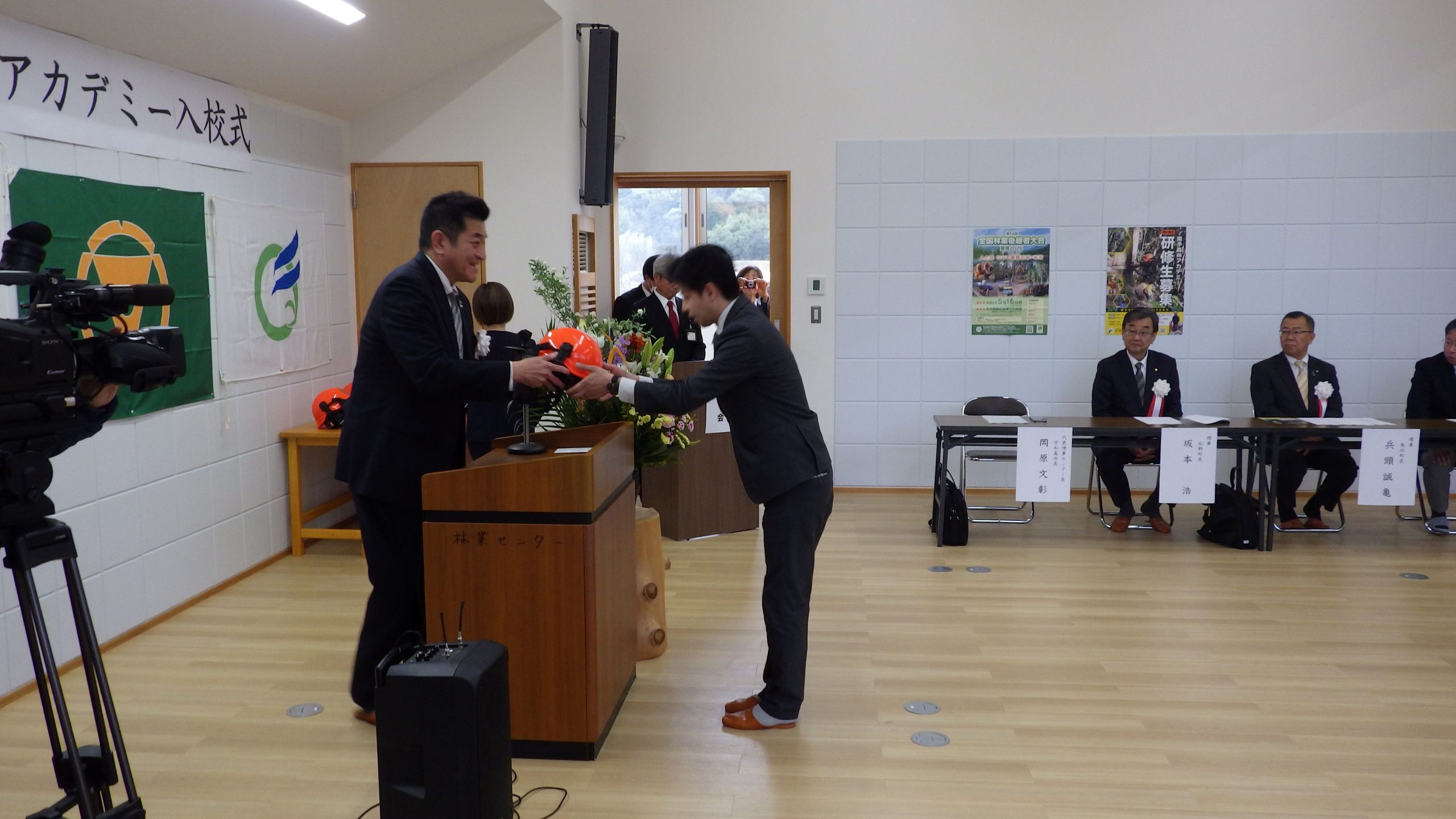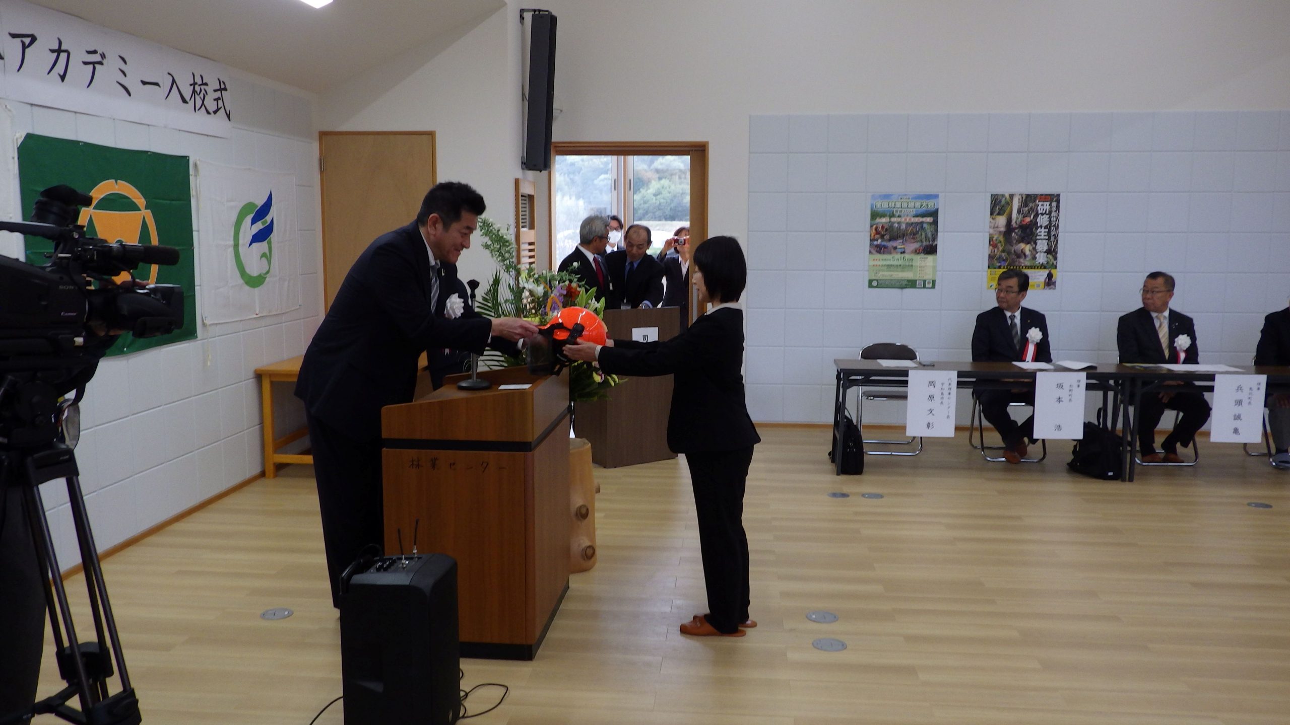 その後ヘルメット贈呈式では、6名の研修生に対し、センター長からピカピカのヘルメットが一人ずつ手渡されました。